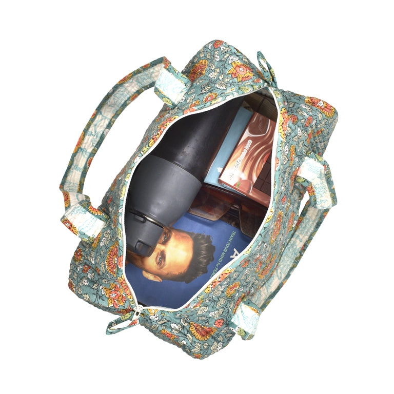 BLOSSOMING ROSES IN MOONSOON HAND BLOCK PRINTED QUILTED TRAVEL MICRO DUFFLE BAG